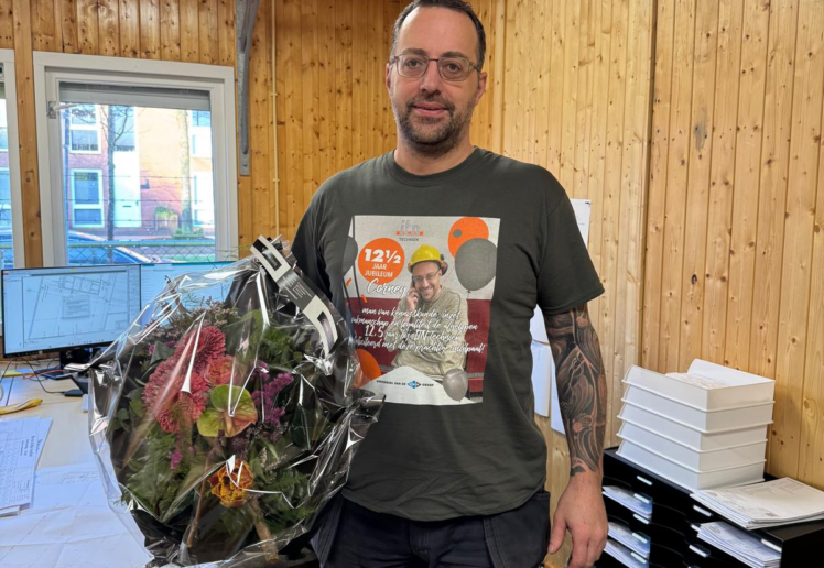 Op de bouwplaats van het prachtige project Huis voor de Stad in Amersfoort hebben we Corney verrast met een bos bloemen, een heerlijke taart en een speciaal ontworpen t-shirt. Een klein gebaar om een grootse prestatie te vieren.