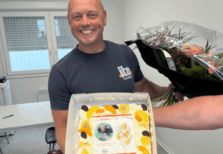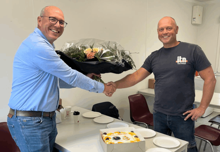 En dat bijzondere jubileum mocht natuurlijk niet stilletjes voorbijgaan. Midden op de bouwplaats verrasten we Tom met een bos bloemen en een taart. Een mooi moment om stil te staan bij zijn betrokkenheid en loyaliteit en om hem te bedanken voor een kwart eeuw vakmanschap.
