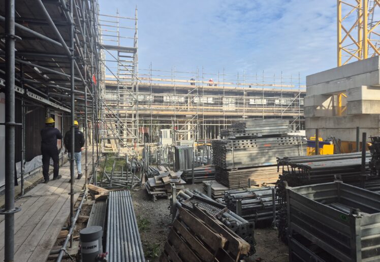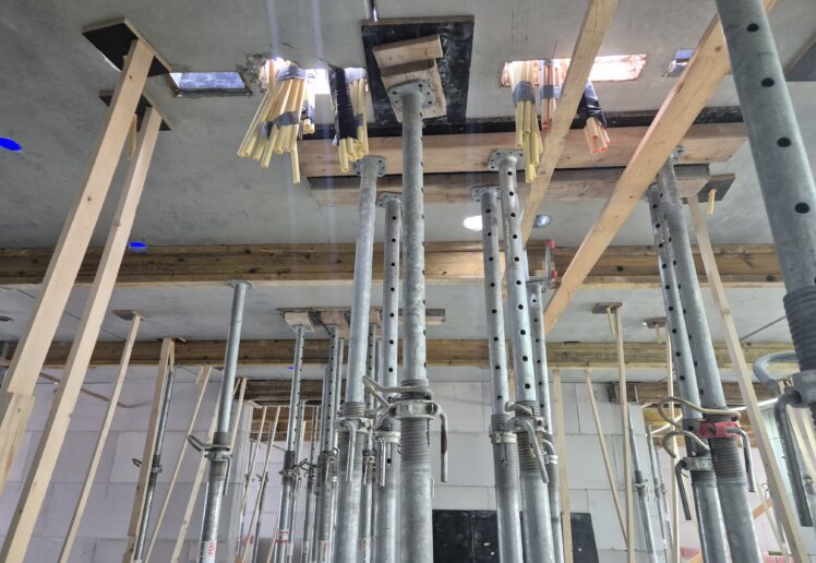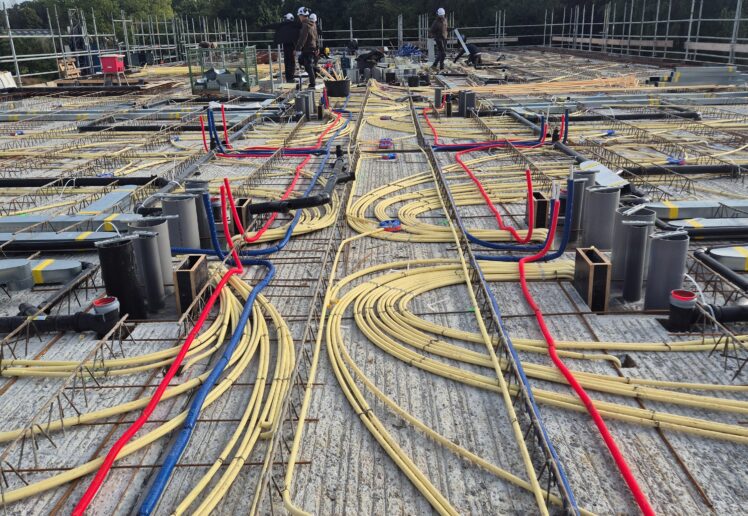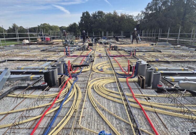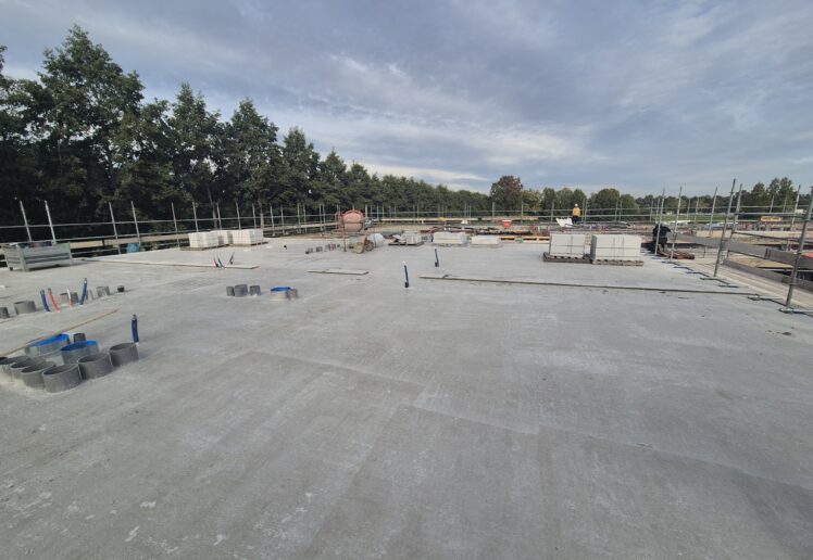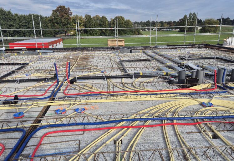 De breedplaatvloer van de eerste verdieping is inmiddels voorzien van alle elektrotechnische en werktuigbouwkundige installaties en gestort. Op dit moment werken we aan de installaties op de tweede verdieping. Tot eind 2025 blijven we bezig met het aanbrengen van de elektrotechnische en werktuigbouwkundige voorzieningen op de breedplaatvloeren, waardoor het gebouw langzaam maar zeker verder groeit.