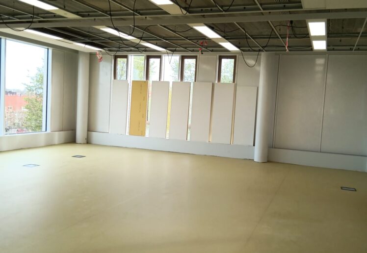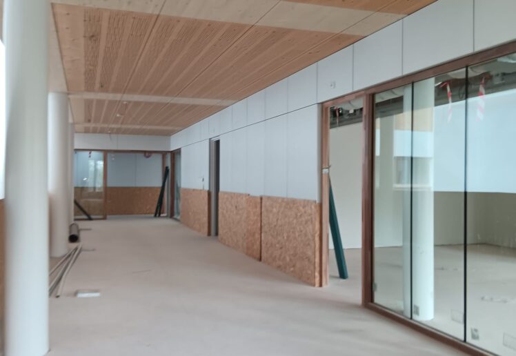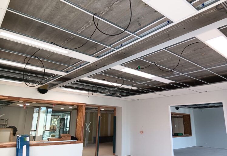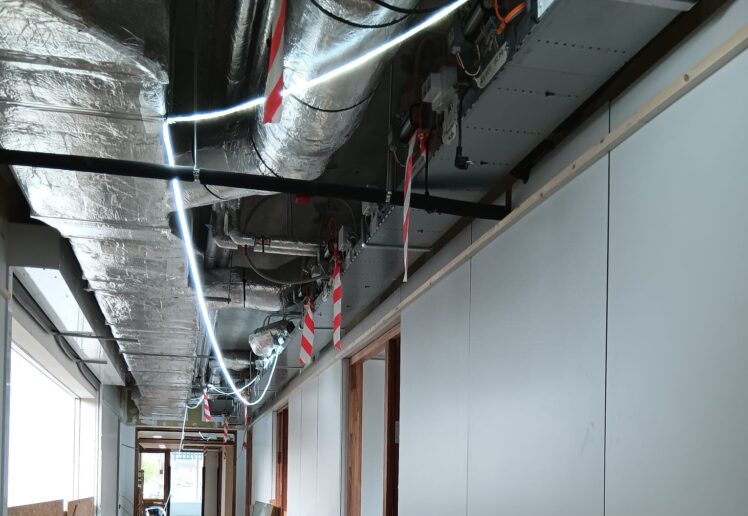 Ook in de elektrotechnische installaties is mooie voortgang geboekt. De binnenwanden zijn inmiddels tot en met de begane grond geplaatst. De bekabeling en kabelgoten zijn aangebracht en op de derde verdieping wordt, gelijktijdig met het aanbrengen van het plafond, de verlichting gemonteerd. Daarnaast worden op diverse plekken de installaties verder afgemonteerd.