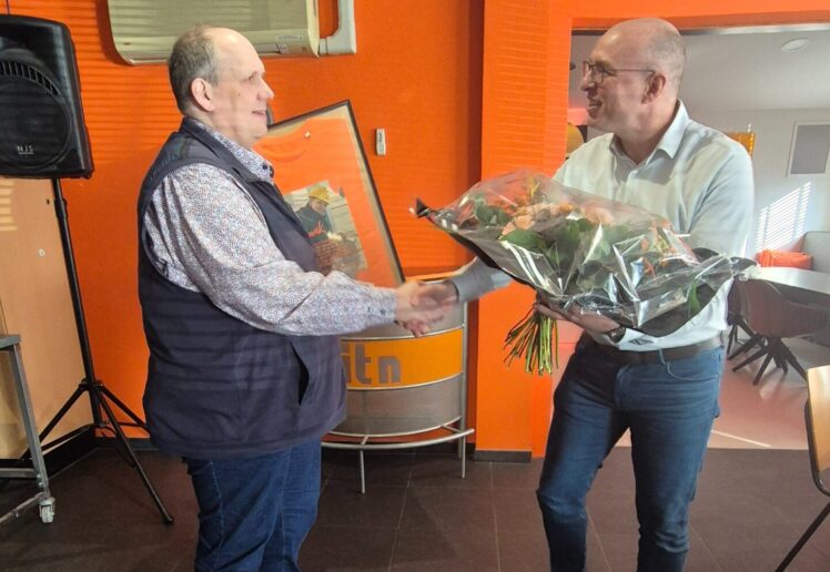 Weinand en Willem werden op de bouw verrast met een heerlijke taart, een leuke magneetsticker voor op de bus, een bos bloemen en een ingelijst t-shirt met een persoonlijke boodschap – een blijk van waardering voor hun jarenlange inzet.