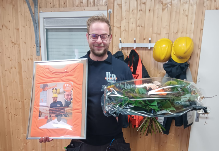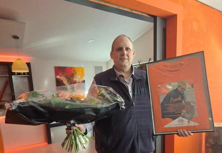 Ook Frank werd in het zonnetje gezet. Op kantoor werd zijn mijlpaal gevierd met een heerlijke taart, en net als zijn collega’s ontving hij een bos bloemen en een ingelijst t-shirt met een persoonlijke boodschap. Als Projectleider is Frank een onmisbare schakel binnen onze projecten. Gedreven en betrokken als hij is, stort hij zich altijd met volle overtuiging op ieder project.